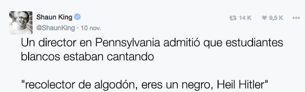 - «Day 1 In Trump’s America: A collection of tweets about racist episodes POC are facing now that Trump is our President Elect”
