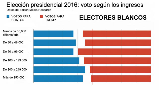 De hecho, el grupo social que más ha apoyado a Trump no es el de los blancos de bajos ingresos sino los que tienen un ingreso anual de entre 50 y 99 mil dólares al año. Dicho esto, no hay que olvidar que de todas formas, en casi todos los estados, la población blanca votó en su mayoría por el asqueroso republicano, cualquiera que sea su nivel de ingreso. Así, según cifras del diario inglés The Guardian, las y los votantes blancxs, que representaban el 69% del electorado, apoyaron a Trump con 58% de sus votos, mientras sólo le dieron a Clinton el 37%.